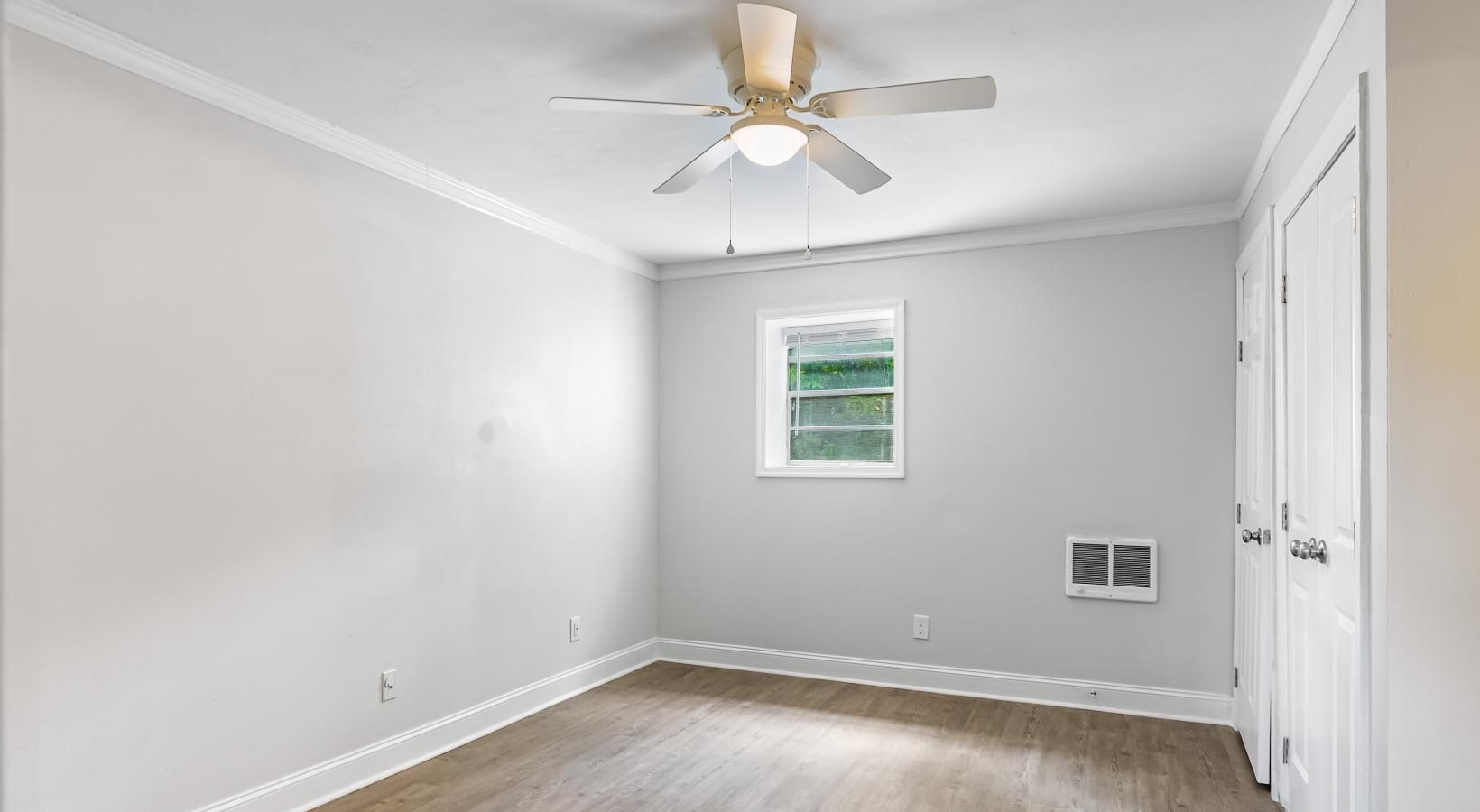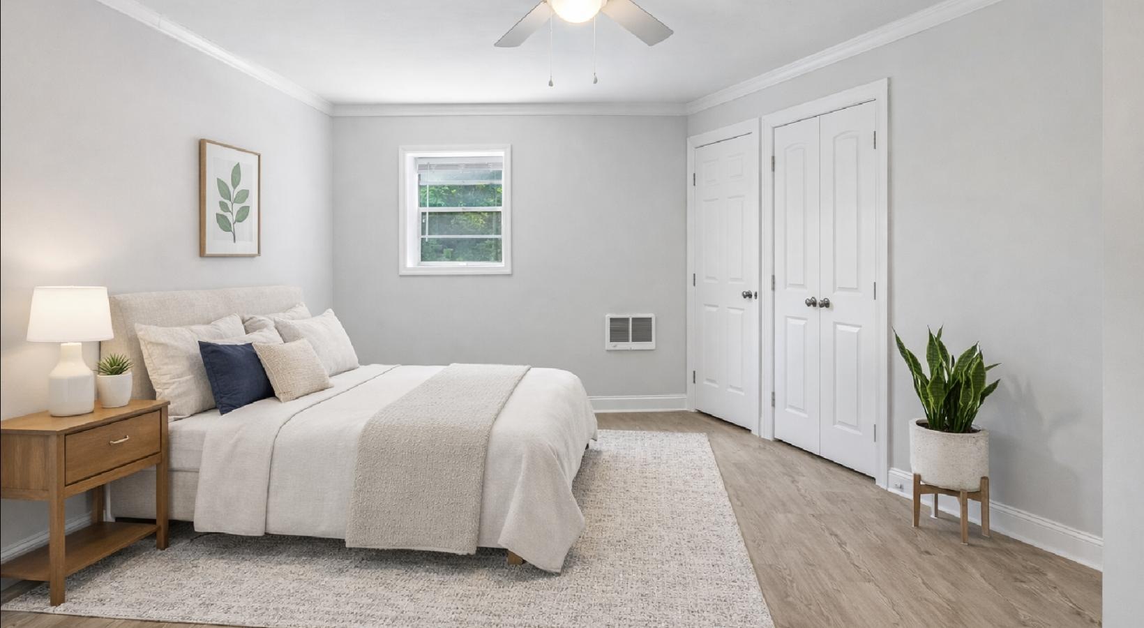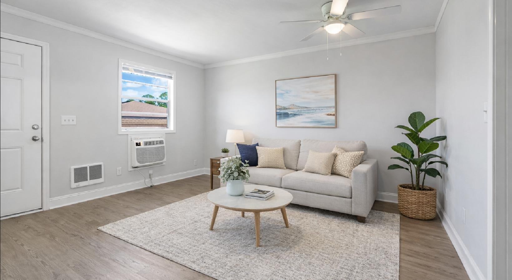 a room with a ceiling fan and a wood floor a large building with a lawn in front of it a building with a lawn and trees a kitchen with white cabinets a bedroom with a bed and a fan a living room with a couch and a table